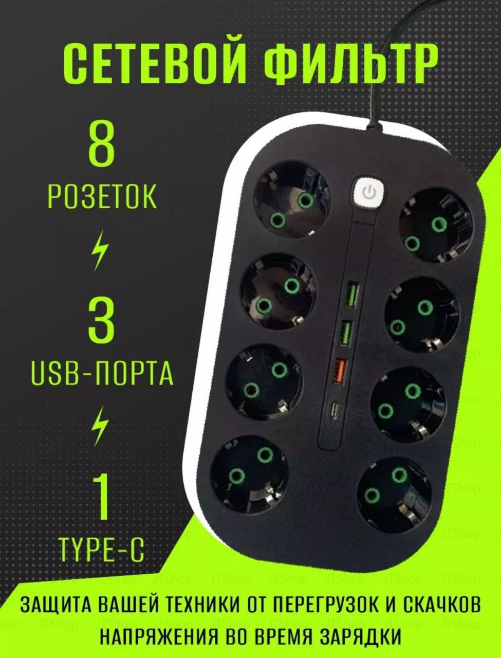Удлинитель, сетевой фильтр, тройник с USB предназначен для бытового использования. Сетевой фильтр совмещает в себе функции тройника EURO розеток, удлинителя и зарядки от USB и TYPE-C. Удлинитель с type имеет следующую комплектацию: 8 EURO розеток, 3 USB, 1 type-c, USB выход 20W. Общие характеристики удлинителя USB: нормальный ток max10A, номинальное напряжение 250B, номинальная мощность 2500W. На сетевом фильтре имеется кнопка вкл\выкл. Удлинитель сетевой с usb портами замечательный подарок и незаменимый помощник в быту.