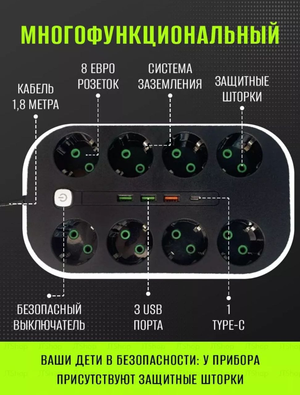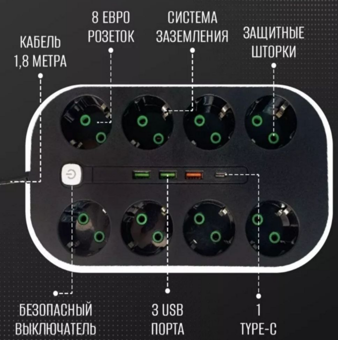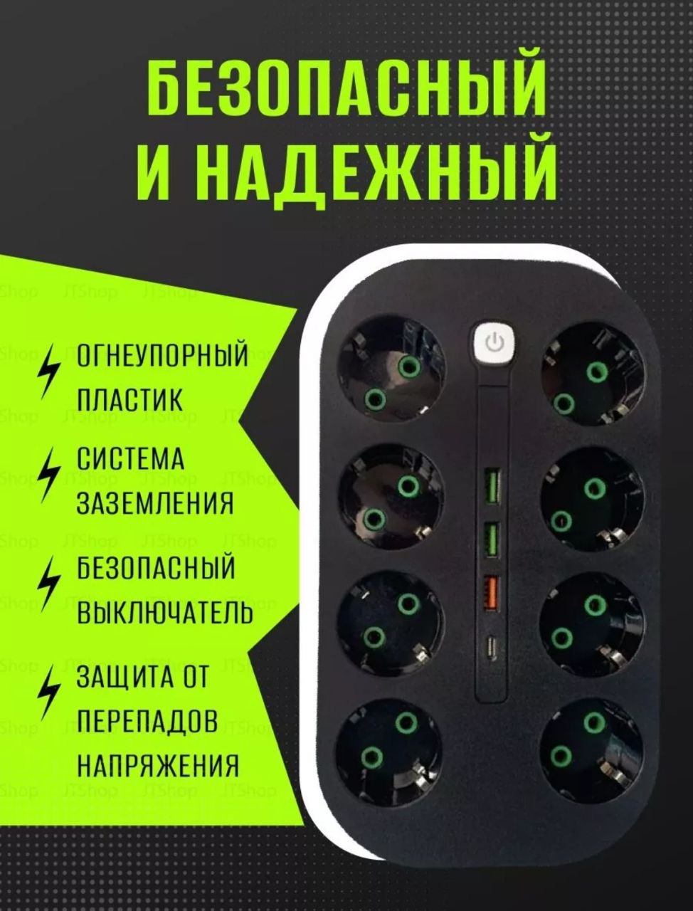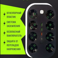 Функциональность сетвого фильтра Включает в себя дополнительные возможности, такие как наличие 8 встроенных розеток, 3 USB-порта и 1 разъём Type-C, позволяющих подключать различные устройства без необходимости использования дополнительных адаптеров. Сетевой фильтр имеет качественную изоляцию, которая предотвращает утечку электричества и защищает от возможных коротких замыканий или пожара. Также он был выполнен из прочных и долговечных материалов, способных выдерживать повседневное использование и различные условия эксплуатации.
